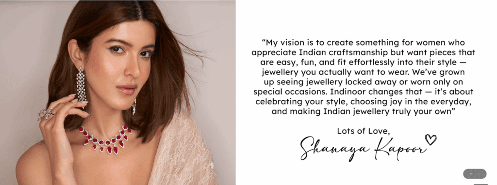 With Shanaya Kapoor as co-creator, Indinoor is more than a jewelry brand; it’s a movement that celebrates modern Indian elegance. Every design reflects artistry, confidence, and warmth.