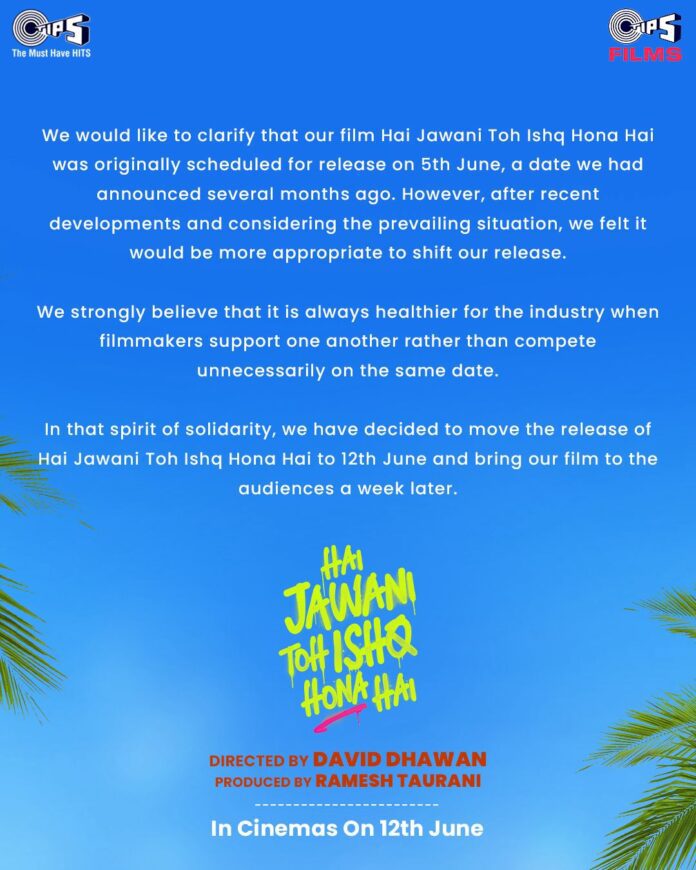 In an official statement, Ramesh Taurani, Managing Director of Tips Films shared, “We would like to clarify that our film – Hai Jawani Toh Ishq Hona Hai was originally scheduled for release on 5th June, a date we had announced several months ago. However, after recent developments and considering the prevailing situation, we felt it would be more appropriate to shift our release.”